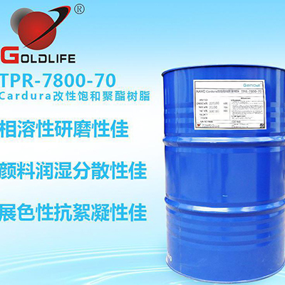 TPR-7800-70系Cardura E-10变性饱和聚酯树脂,具有优异的颜料润湿性及分散性、展示性及相容性能优异、高固体份低粘度,特别适合用于制作通用色膏、亦可用作工业烤漆、喷漆及金属用喷漆改质剂等。
